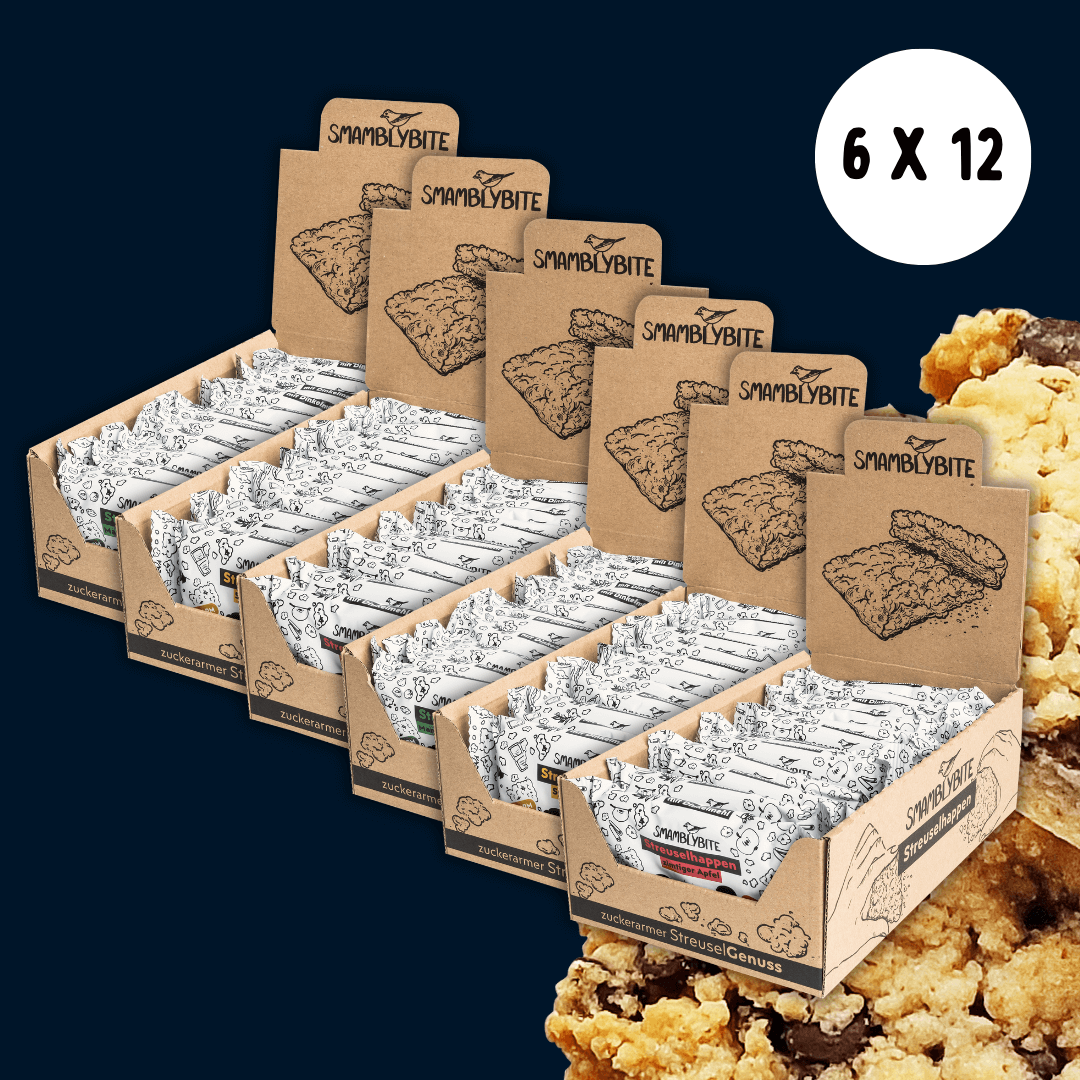 Drei Sorten, drei Streuselträume: Schokotröpfchen, Apfel-Zimt und Mandel-Haselnuss. Leicht knusprig, buttrig und aromatisch – für alle, die Streusel lieben, nur jetzt im modernen Snack-Format.