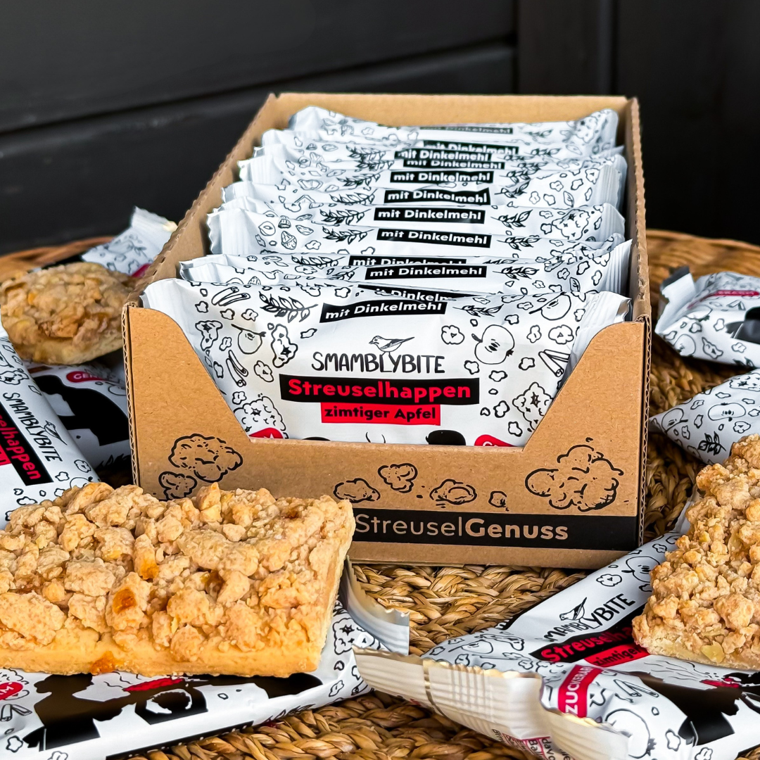 Drei Sorten, drei Streuselträume: Schokotröpfchen, Apfel-Zimt und Mandel-Haselnuss. Leicht knusprig, buttrig und aromatisch – für alle, die Streusel lieben, nur jetzt im modernen Snack-Format.